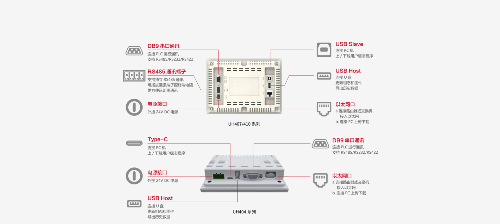| UH 404E | 4.3"TFT | 480×272 | USB2.0×1,Type A(USB1),支持U盤更新(xin)固件、組态咊(he)存儲數(shu)據 | Type C,支持供電(dian)、程(cheng)序上下載 | COM1:RS485 COM2:RS232 | 10M/100 M自适應 | 138×101×32mm | |